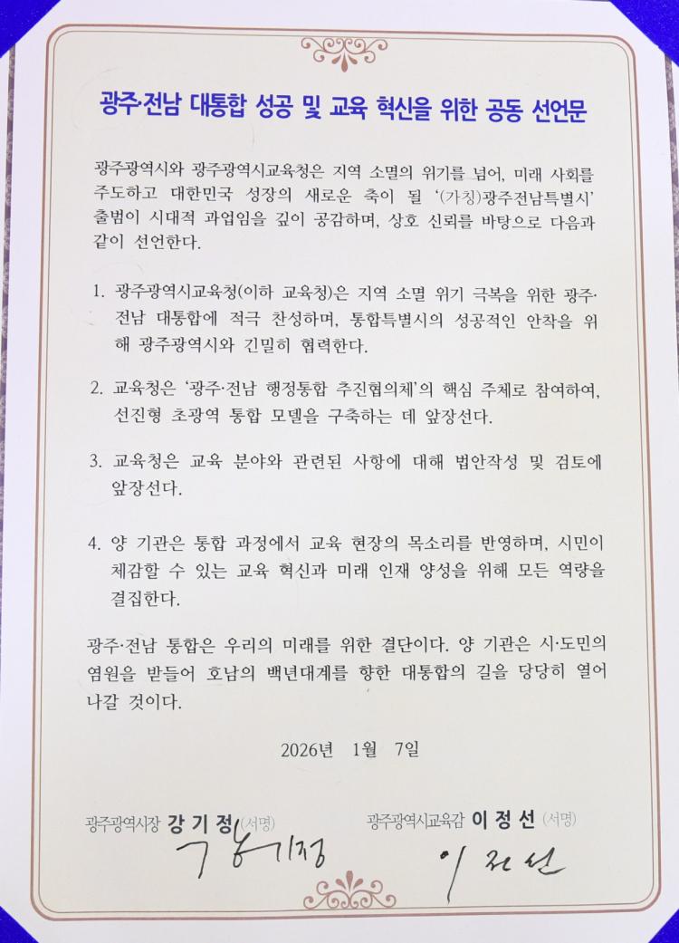 ÀÌÁ¤¼± ±¤Áֽñ³À°°¨°ú °±âÁ¤ ±¤ÁÖ½ÃÀåÀº 7ÀÏ ½Ãû ºñÁî´Ï½º·ë¿¡¼ ¸¸³ª ¡®±¤ÁÖ¡¤Àü³² ´ëÅëÇÕ ¼º°ø ¹× ±³À° Çõ½ÅÀ» À§ÇÑ °øµ¿ÇÕÀǹ®¡¯¿¡ ¼¸íÇß´Ù.