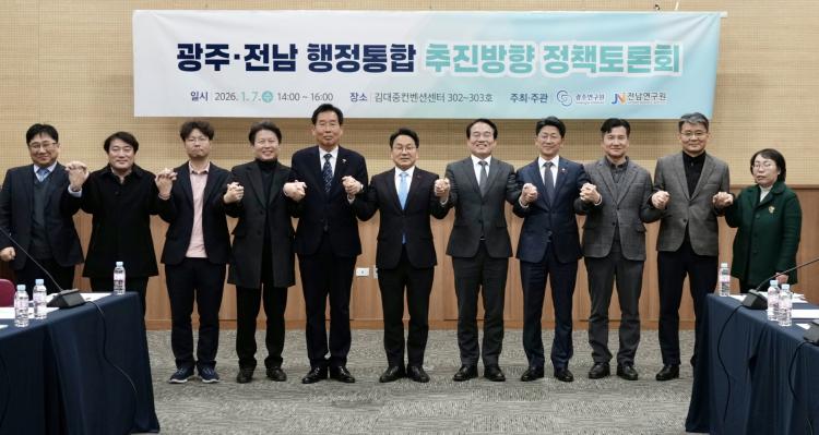 [ÇÁ·¹½ºÁ¸] ±¤ÁÖ¿¬±¸¿ø(¿øÀå ÃÖÄ¡±¹)°ú Àü³²¿¬±¸¿ø(¿øÀå ±è¿µ¼±)Àº 7ÀÏ ¿ÀÈÄ ±è´ëÁßÄÁº¥¼Ç¼¾ÅÍ¿¡¼ ±¤ÁÖ¡¤Àü³² ÇàÁ¤ÅëÇÕ ÃßÁø Çʿ伺¿¡ ´ëÇÑ »çȸÀû °ø°¨´ë¸¦ È®º¸ÇÏ°í ¼º°øÀû ÅëÇÕ ¹æ¾ÈÀ» ¸ð»öÇϱâ À§ÇØ ¡®±¤ÁÖ¡¤Àü³² ÇàÁ¤ÅëÇÕ ÃßÁø ¹æÇâ Á¤Ã¥Åä·Ðȸ¡¯¸¦ °³ÃÖÇß´Ù.