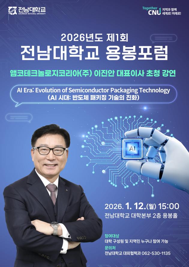 ¿ÀÈÄ 3½Ã Àü³²´ëÇб³ ¿ëºÀȦ¿¡¼´Â ¿ëºÀÆ÷·³(±â³ä°ÀÇ)ÀÌ °³ÃÖµÅ, ÀÌÁø¾È ´ëÇ¥°¡ ¡®AI ½Ã´ë: ¹ÝµµÃ¼ ÆÐŰ¡ ±â¼úÀÇ ÁøÈ¡¯¸¦ ÁÖÁ¦·Î Ư°À» ÁøÇàÇÑ´Ù. À̹ø Æ÷·³Àº ¹ÝµµÃ¼ ÆÐŰ¡ ±â¼úÀÇ ¹ßÀü ¹æÇâ°ú »ê¾÷¡¤´ëÇÐ Çù·ÂÀÇ Á߿伺À» ´ëÇÐ ±¸¼º¿ø°ú Áö¿ª»çȸ¿Í ÇÔ²² ³íÀÇÇÑ´Ù.