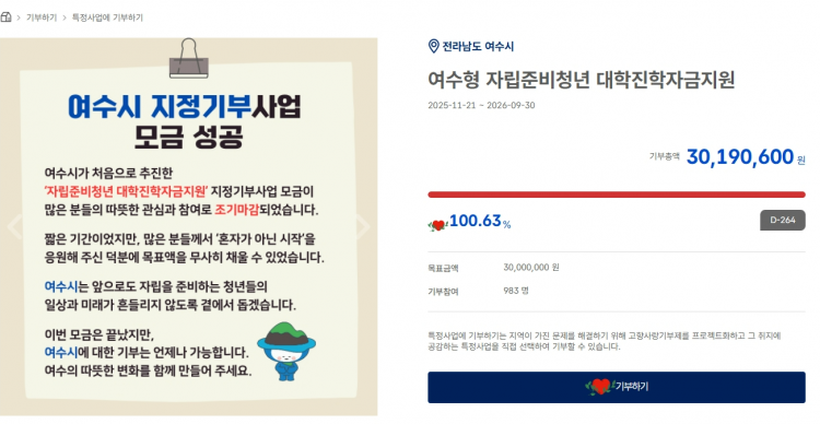 [ÇÁ·¹½ºÁ¸] Àü³² ¿©¼ö½Ã´Â ÀÛ³â ÇÑ ÇØ µ¿¾È °íÇâ»ç¶û±âºÎ±ÝÀ¸·Î ÃÑ 14¾ï9õ¸¸ ¿øÀ» ¸ð±ÝÇÏ¸ç ¸ñÇ¥¾× 8¾ï ¿øÀ» 186% Ãʰú ´Þ¼ºÇÏ´Â ¼º°ú¸¦ °ÅµÖ µµ³» ¸ð±Ý¾× ¼øÀ§ 3À§¿¡ ¿Ã¶ú´Ù.
