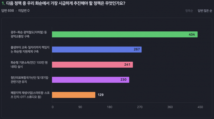 ÀÓÁö¶ô µµÀÇ¿ø Ãø¿¡ µû¸£¸é ¡°À̹ø ¿Â¶óÀÎ ¼³¹®¿¡ ÃÑ 746°ÇÀÌ Á¢¼öµÇ¾úÀ¸¸ç, ÀÌ °¡¿îµ¥ ¹«È¿¡¤Áߺ¹ ÀÀ´ä 48°ÇÀ» Á¦¿ÜÇϰí ÃÑ 698°ÇÀÌ À¯È¿ ÀÀ´äÀ¸·Î Áý°èµÇ¾ú´Ù¡±¸ç, ¡°698°Ç °¡¿îµ¥ ±¤ÁÖ~ȼø ±¤¿ªÃ¶µµ(ÁöÇÏö) À¯Ä¡ ÀÀ´äÀÌ 434°ÇÀ¸·Î ¾ÐµµÀû 1À§¡±¶ó°í ¹àÇû´Ù.