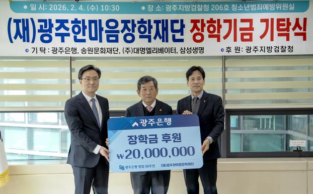 [ÇÁ·¹½ºÁ¸] ±¤ÁÖÀºÇà(ÀºÇàÀå Á¤Àϼ±)Àº 4ÀÏ ±¤ÁÖÁö¹æ°ËÂûû¿¡¼ °ÁöÈÆ ±¤ÁÖÀºÇà ¿µ¾÷1º»ºÎ ºÎÇàÀå°ú ±èÁ¾¿ì ±¤ÁÖÁö¹æ°ËÂûû °Ë»çÀå, ÇÑ»ó¿ø ±¤ÁÖÇѸ¶À½ÀåÇÐÀç´Ü ÀÌ»çÀåÀÌ Âü¼®ÇÑ °¡¿îµ¥, (Àç)±¤ÁÖÇѸ¶À½ÀåÇÐÀç´Ü¿¡ ÀåÇÐ±Ý 2õ¸¸ ¿øÀ» Àü´ÞÇß´Ù°í ¹àÇû´Ù.