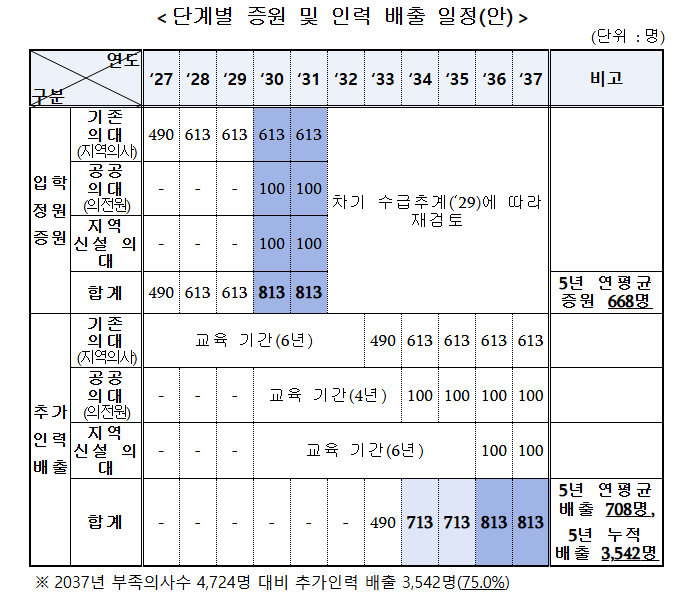º¸Á¤½ÉÀÌ ÀǰáÇÑ ÀÇ»çÀη ¾ç¼º±Ô¸ð(¾È)ÀÌ ±³À°ºÎÀÇ °¢ ´ëÇк° ¹èÁ¤À» °ÅÃÄ ¡¯27³âºÎÅÍ Àǰú´ëÇÐ ¸ðÁýÁ¤¿ø¿¡ ¹Ý¿µ․½ÃÇàµÇ¸é 2033³âºÎÅÍ 2037³â±îÁö ÃÑ 3,542¸í, ¿¬Æò±Õ 708¸íÀÇ ÀÇ»çÀηÂÀÌ Ãß°¡ ¹èÃâµÈ´Ù.