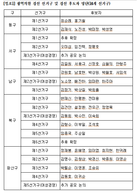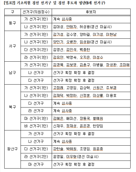 ¾Õ¼ ´õºÒ¾î¹ÎÁÖ´ç ±¤ÁÖ±¤¿ª½Ã´ç °øÁ÷¼±°ÅÈĺ¸ÀÚÃßõ°ü¸®À§¿øÈ¸´Â ±¤¿ªÀÇ¿ø ¹× ±âÃÊÀÇ¿ø Èĺ¸ÀÚ ¸éÁ¢ ½É»ç µî °øÃµ ½É»ç ÀýÂ÷¸¦ ÁøÇàÇßÀ¸¸ç, °ø°üÀ§ ½ÉÀǸ¦ ÅëÇØ °æ¼±Áö¿ª, °æ¼±Èĺ¸ÀÚ, °æ¼±¹æ¹ýÀ» È®Á¤Çß°í, ´çÇå¿¡ µû¶ó »ó¹«À§¿øÈ¸´Â À̸¦ ÃÖÁ¾ ÀǰáÇß´Ù.