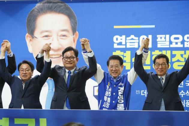 | ±è¿µ·Ï ¹ÎÁÖ´ç Àü³²±¤ÁÖÆ¯º°½ÃÀå ¿¹ºñÈ帰¡ 11ÀÏ ¼±°Å »ç¹«½Ç¿¡¼ ¼Û¿µ±æ Àü ¹ÎÁÖ´ç ´ëÇ¥ , ½ÅÁ¤ÈÆ ±¹È¸ÀÇ¿ø, °±âÁ¤ ±¤ÁÖ±¤¿ª½ÃÀå, ±¤ÁÖ 4°³ ±¸Ã»Àå°ú ÇÔ²² ¼ÕÀâ°í ½Â¸®¸¦ ´ÙÁüÇϰí ÀÖ´Ù . |